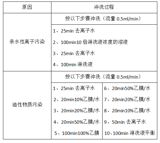 離子交換柱長時間在緩沖溶液中使用和進樣,將導致色譜柱離子交換能力下降,.用稀酸緩沖溶液沖洗可以使陽離子柱再生,反之,用稀堿緩沖溶液沖洗可以使陰離子柱再生. 另外,還可以選擇能溶解柱內(nèi)污染物的溶劑為流動相做正方向和反方向沖洗.但再生后的色譜柱柱效是不可能恢復到新柱的水平的。如果柱子裝反了,可以調(diào)回來,但可能會造成柱內(nèi)擔體塌陷.在不得已的情況下盡量不要反裝色譜柱。
